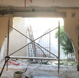We converted a bedroom into a kitchen. A large window sat at one end. The wall opposite the window, had a door leading into what will become the living room dining room. We widened the door leading into the dining room and opened up the window to make a walk out to a side patio and garden.